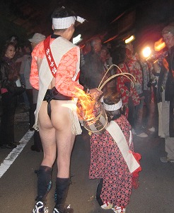 18時頃より、「神事にまいらっしゃれ」という神事触れの合図により集落の各戸に積まれた松明に点火。